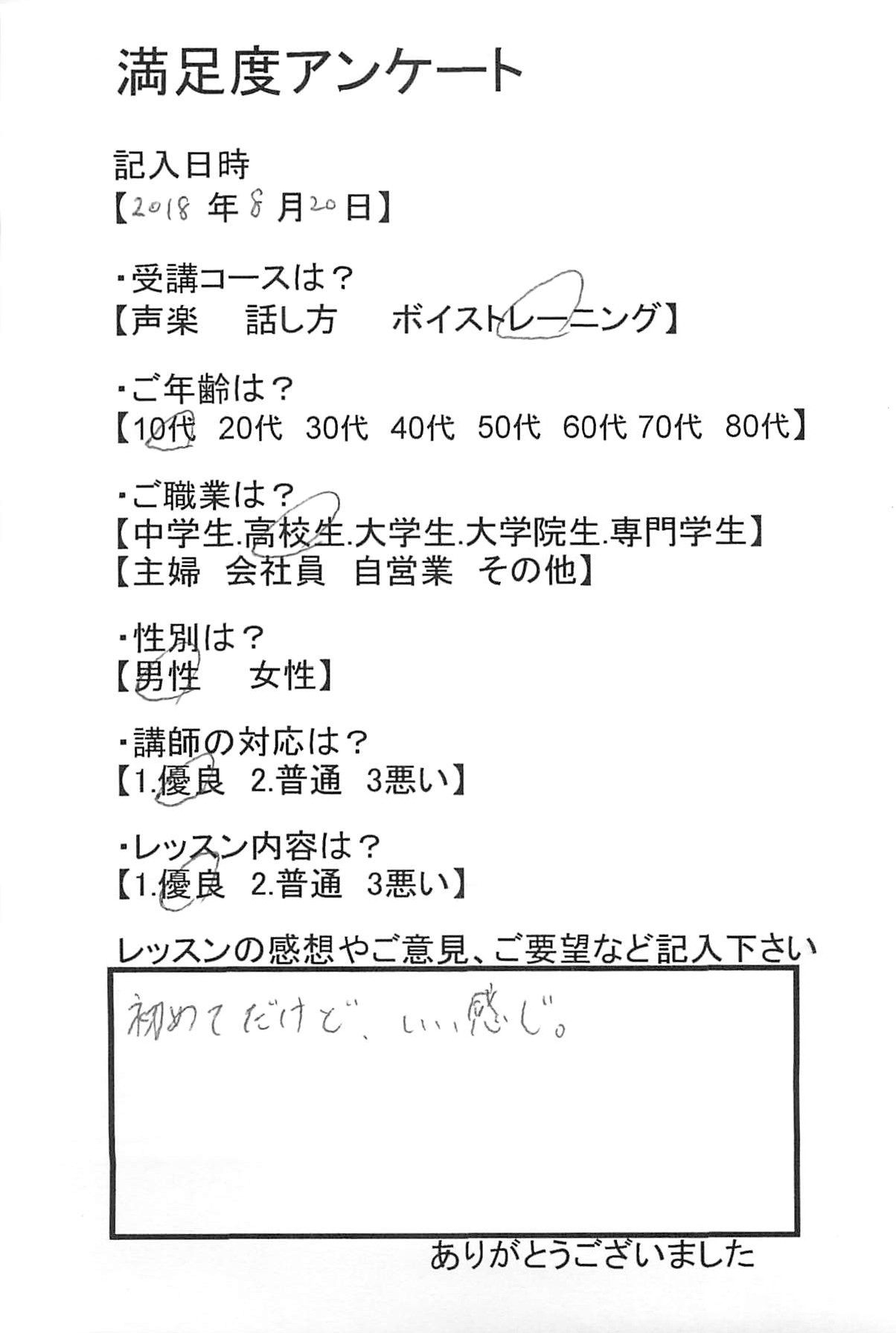 • 10代男性ボイトレ満足度アンケート2018年08月